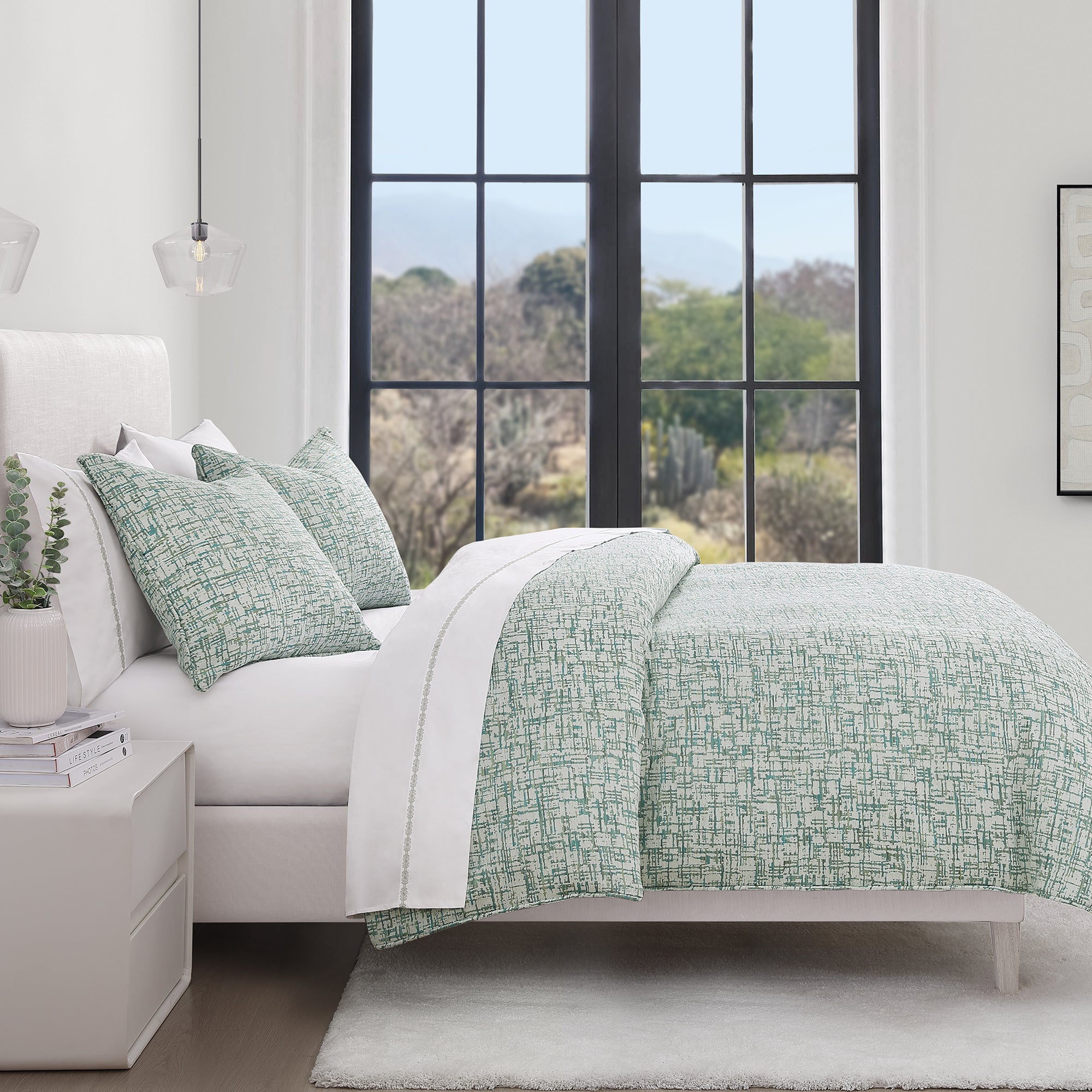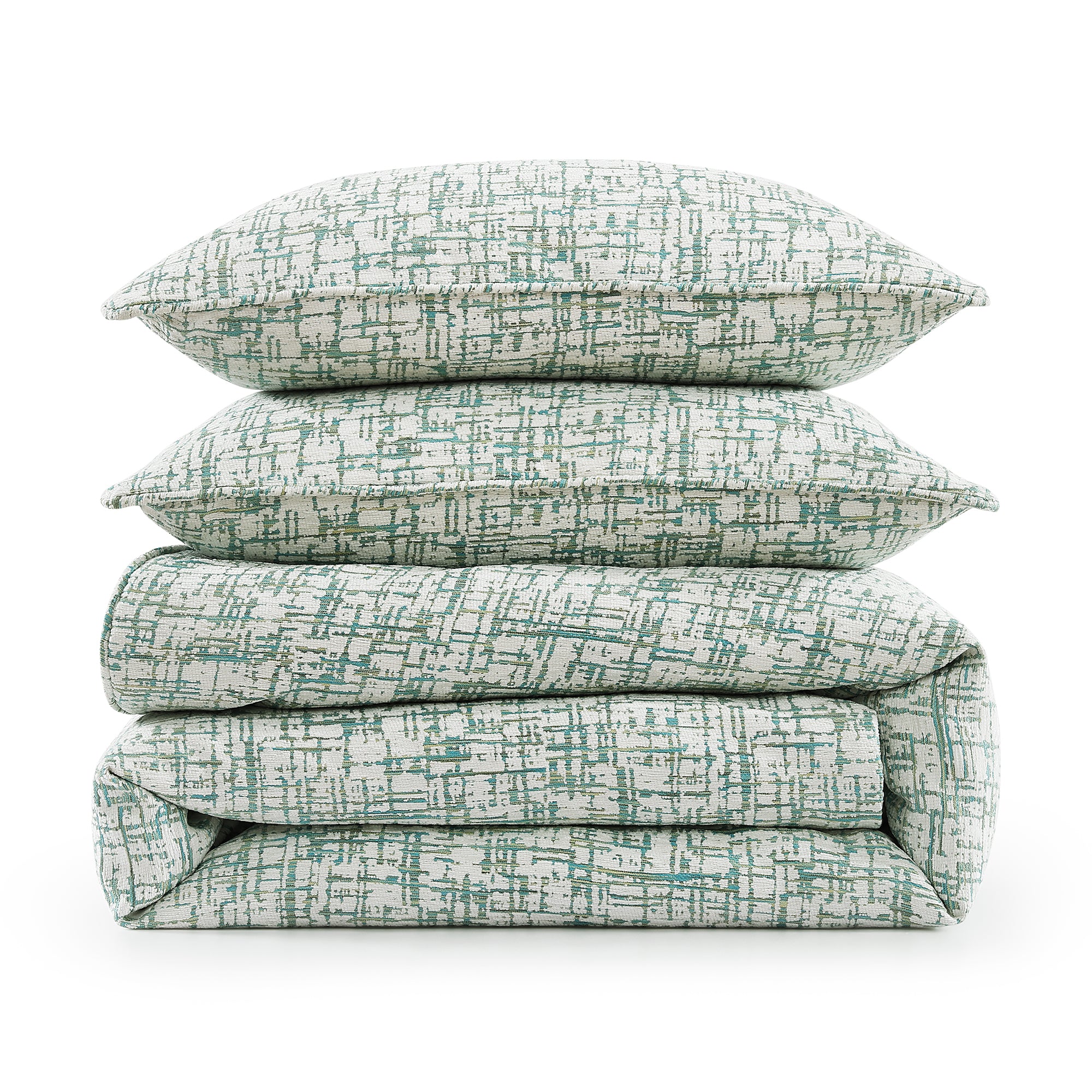 Embrace modern serenity with our Keziah Bedding Set, where architectural precision meets textile artistry. The distinctive cross-hatch pattern in soothing jade green creates a contemporary geometric statement against a crisp white background. Crafted from premium chenille jacquard with space-dyed yarns, this modern luxury bedding offers luxurious softness with subtle dimensional texture. Its tranquil palette of cool greens paired with deep teal accents brings the calming essence of nature indoors, while the durable yet refined construction provides year-round comfort — everyday luxury that’s as practical as it is beautiful.